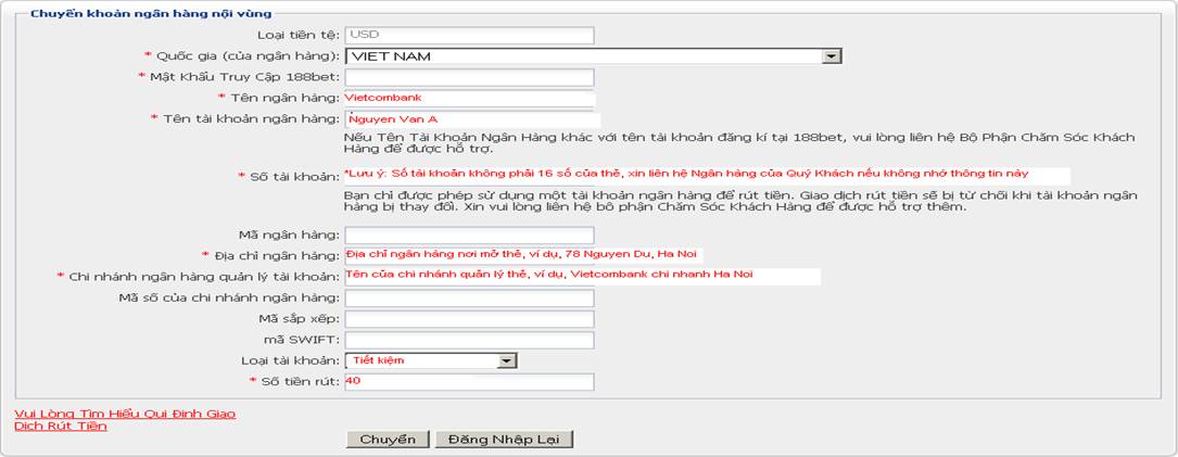 Nộp tiền theo hình thức Chuyển Khoản Ngân Hàng Địa Phương chỉ nhận tiền Đồng Việt Nam, khoản tiền nộp vào tài khoản Ngân Hàng sẽ được chuyển đổi theo tỉ giá cố định tại 188BET (1 USD = 19,000 VND) (có hiệu lực từ 11:01 AM ngày 15/09/2010).vui lòng sử dụng tỉ giá này đến khi có thông báo mới tại Site.