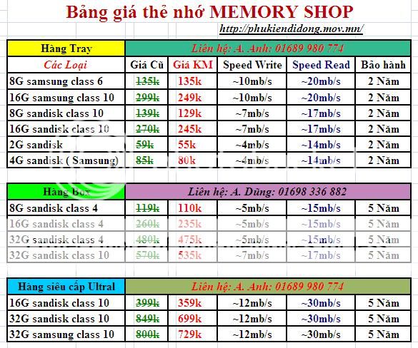 Bắt đầu từ ngày 1/10 MEMORY SHOP bán loại thẻ 8G sam sung class 6 mới "Made in Taiwan" và thẻ 32G sam sung class 10 "Made in Korea" cực tốt, siêu bền