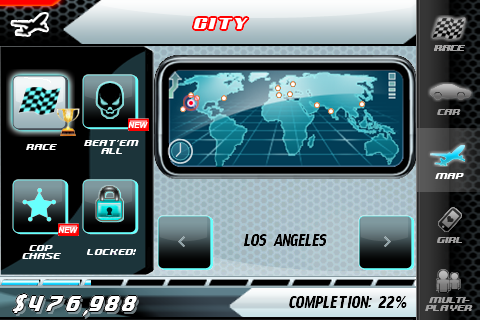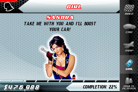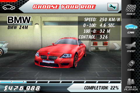 Game có nhiá»u loại xe để lá»±a chá»n (Ä‘iá»u kiện phải thi đấu và thắng được má»™t số tiá»n nhất định thì game sẽ mở ra thêm xe má»›i). Má»—i lần thắng, bạn sẽ có thêm được các chi tiết kÄ© thuật để thay đổi kết cấu cá»§a xe, nói nôm na là "độ" xe cho khá»§ng hÆ¡n. Các bạn để ý có cái xe máy mà thá»i gian tăng tốc từ 0-100 km/h có 3s (chưa kể vá» sau độ thêm thì thá»i gian giảm đến đâu.^_^.)